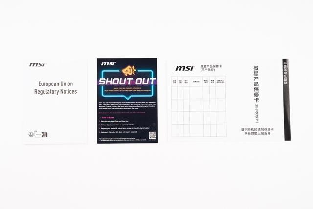 附件纸片,包括欧洲监管通知、宣传卡片、产品保修卡。