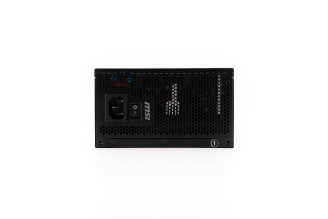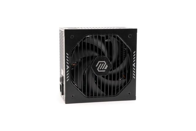 风扇侧,风扇罩中间有MAG系列logo,左右两侧有条纹装饰,风扇部分采用135 mm FDB 液态动力轴承风扇,使电源在冷却性能和噪音水平之间取得良好的平衡,并延长风扇寿命。