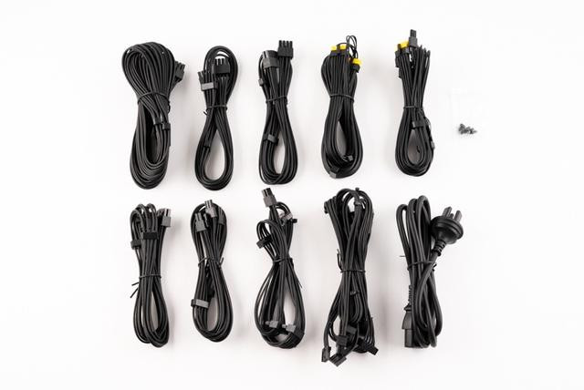 压花编织模组线、供电电源线和安装螺丝。模组线包括1条ATX 20+4 Pin主板供电线、2条EPS 4+4 Pin CPU供电线、1条PCI-E 5.1 12V-2x6供电线、1条PCI-E转12V-2x6接口供电线、2条PCI-E供电线(每条包括2个6+2 Pin接头)、2条SATA供电线(每条包括4个接头)、1条MOLEX+FDD供电线(包括3个MOLEX接头和1个FDD接头)。